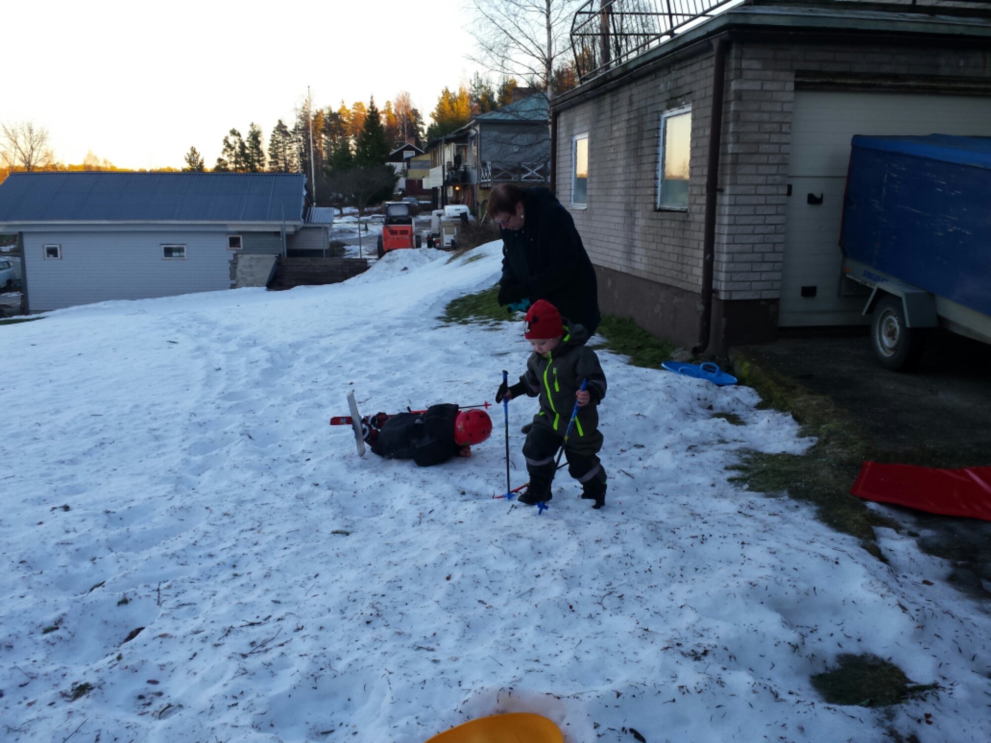 Lite senare testades åkmadrassen och även skidorna som dom fick i julklapp, på den hårda snön vi har på gräsmattan. Inte så bra före. Men barnen var glada.