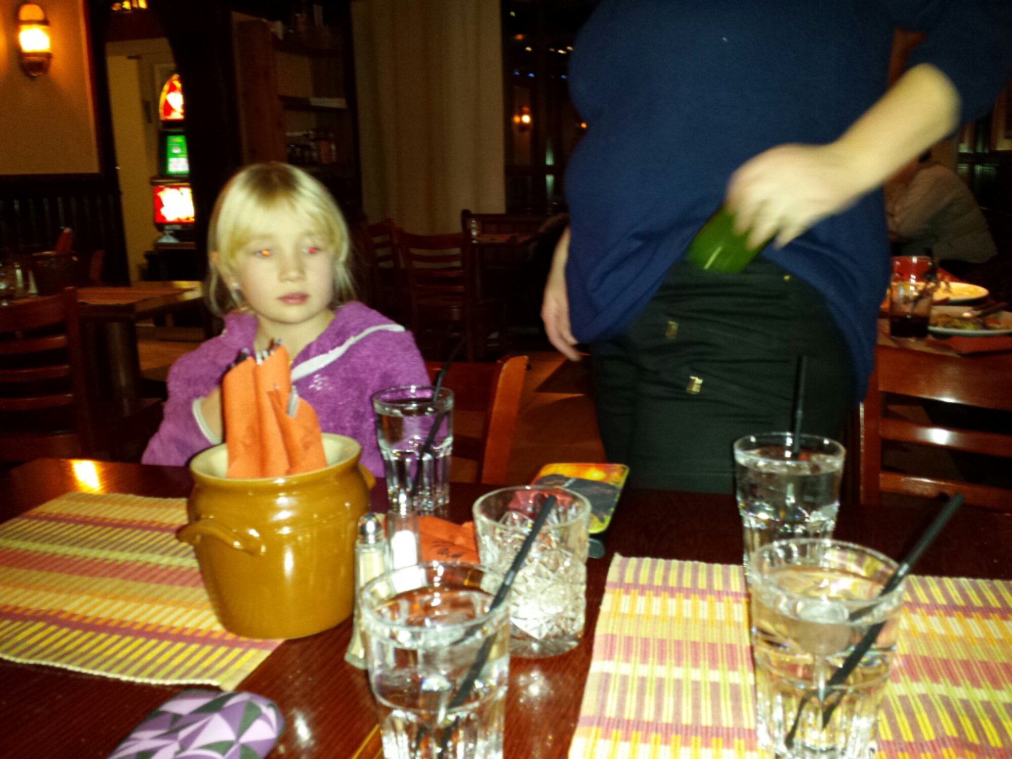 Johanna väntar på maten på hotellets bar. Stora och goda portioner.