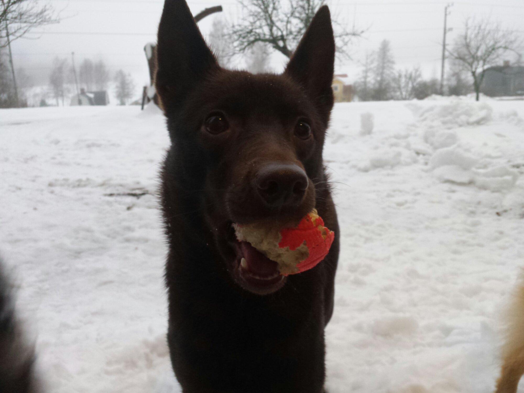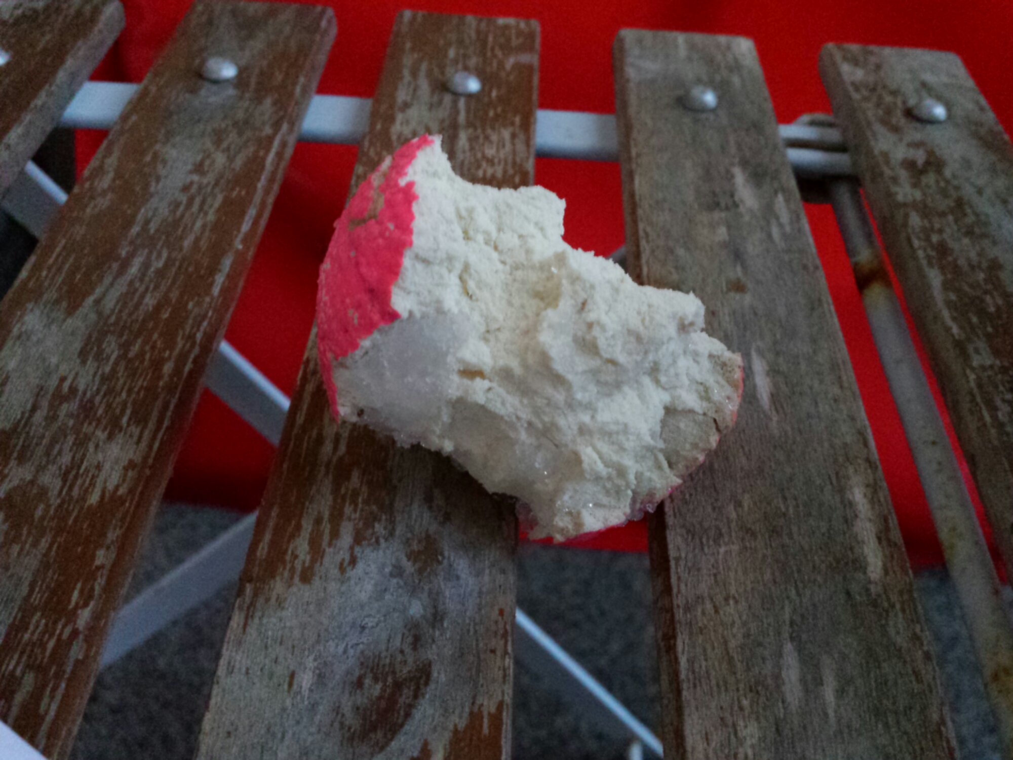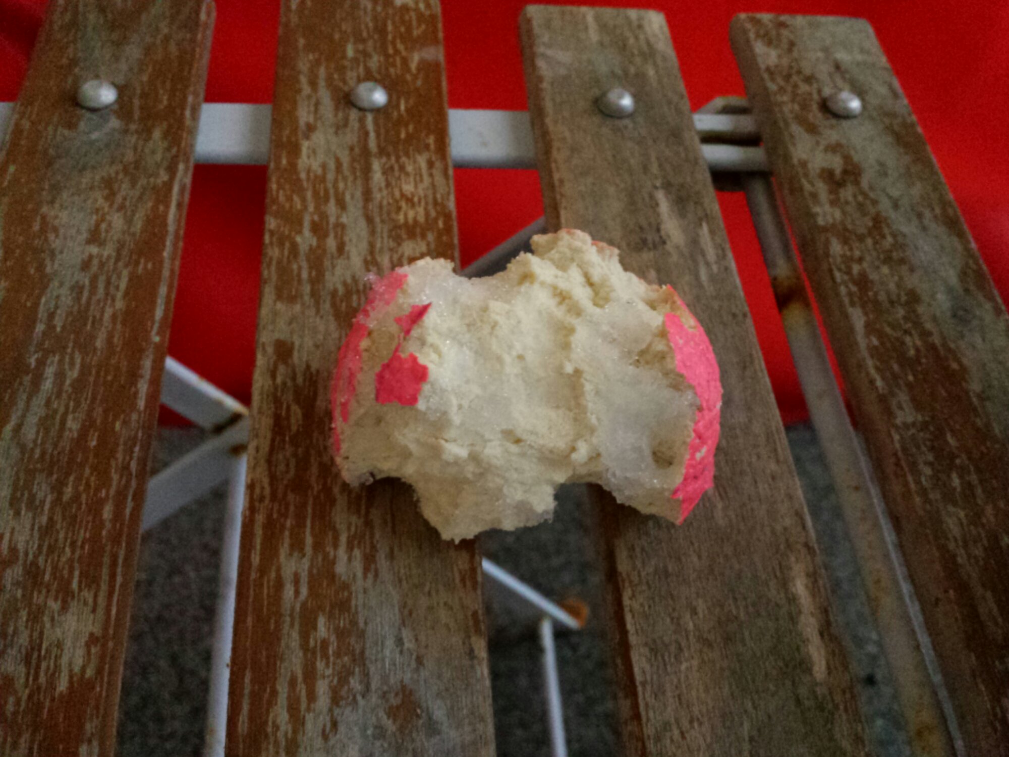Bollen som innan promenaden var lite sliten men ändå hade sitt rosa yttre kvar, ser numera ut som en äppelskrutt.