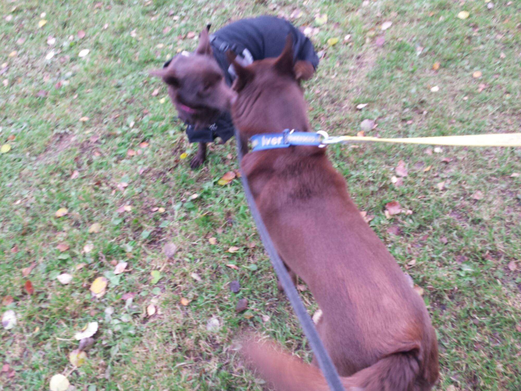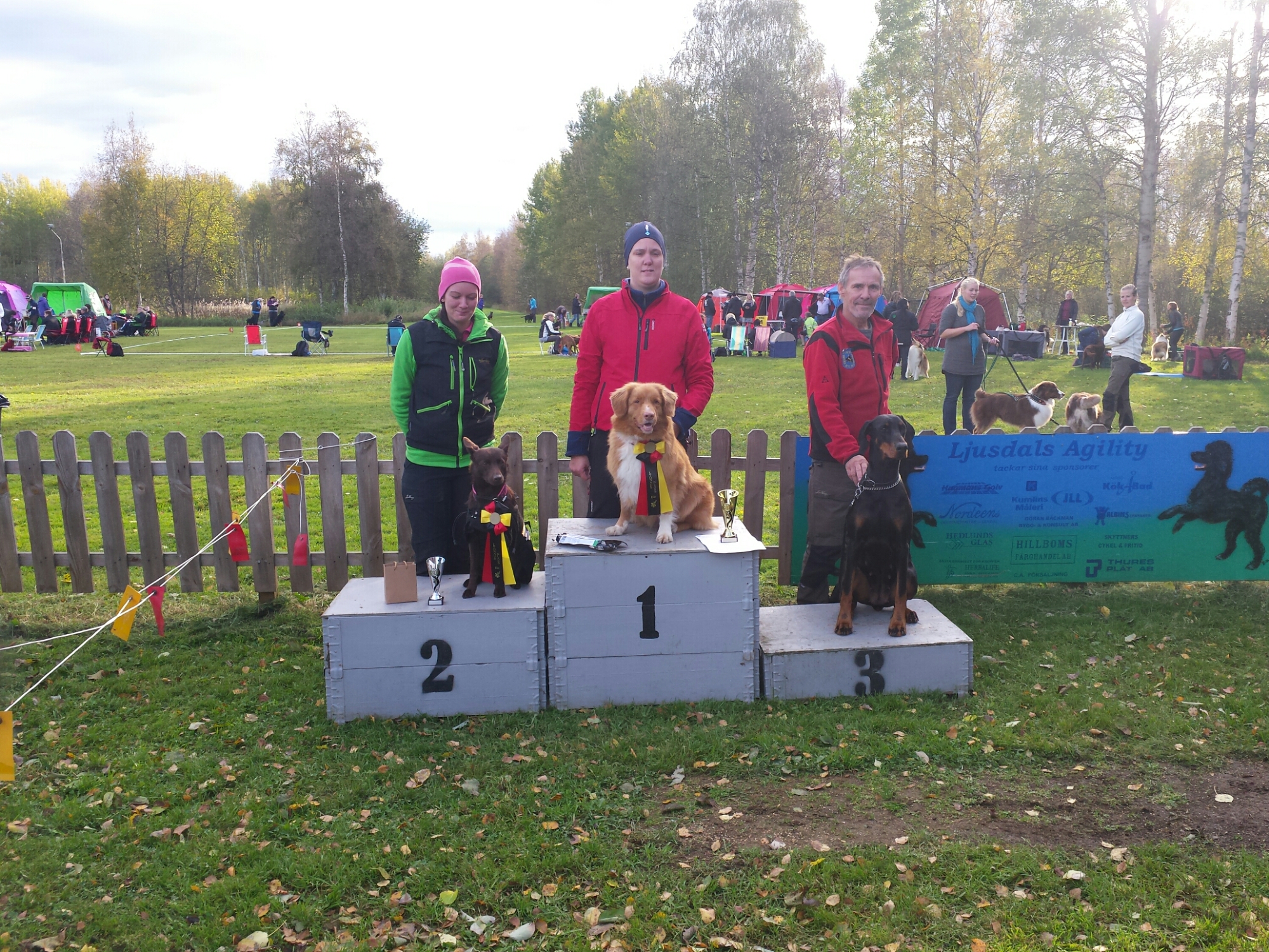 På platssittningen så tyckte Håkans dobermann att Lilja såg skojig ut så hon sprang fram till Lilja när vi ställde upp. Lilja blev lite förskräckt först, men det gick bra.