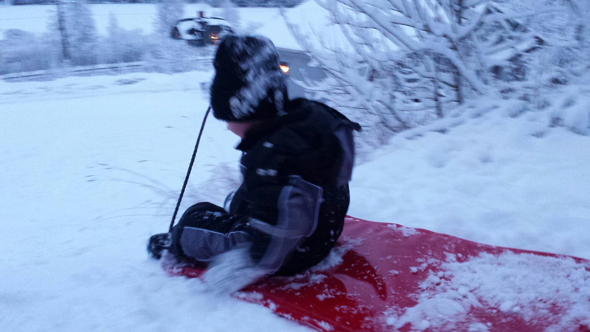 Bild från gårdagens pulkaåkning, idag var det tyvärr alldeles för kallt och blåsigt för att vara ute längre stunder.