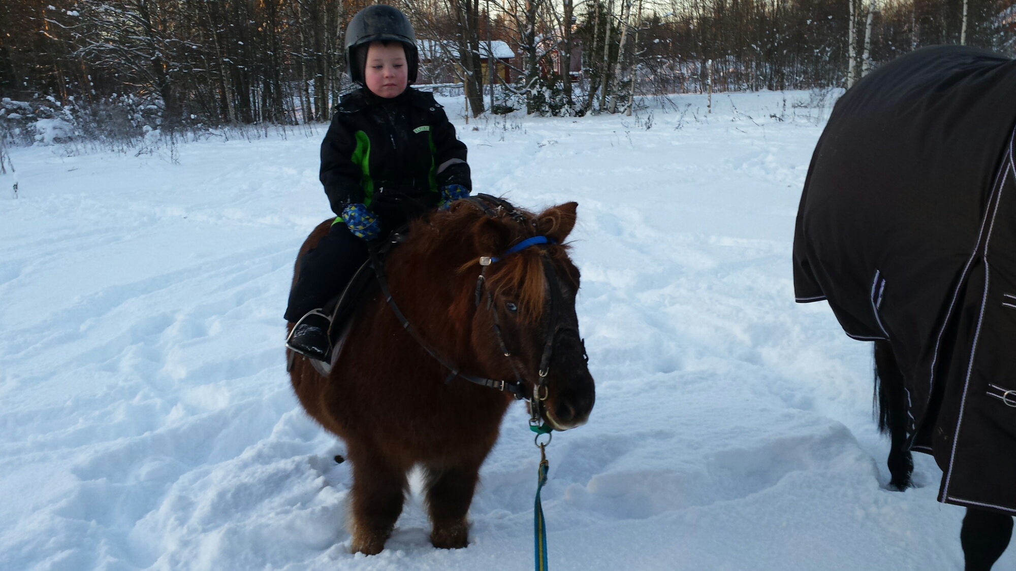 Love ville rida på sin Kalle idag. Vi tränade på att styra, stanna och starta shettisbusen i hagen.