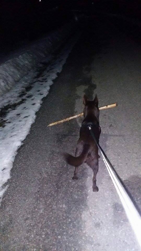 Kelpiesessan hittade en gren att slita loss och bära med sig hem. Ska man inte vara lite slapp och mogen som nybliven mamma? 😉