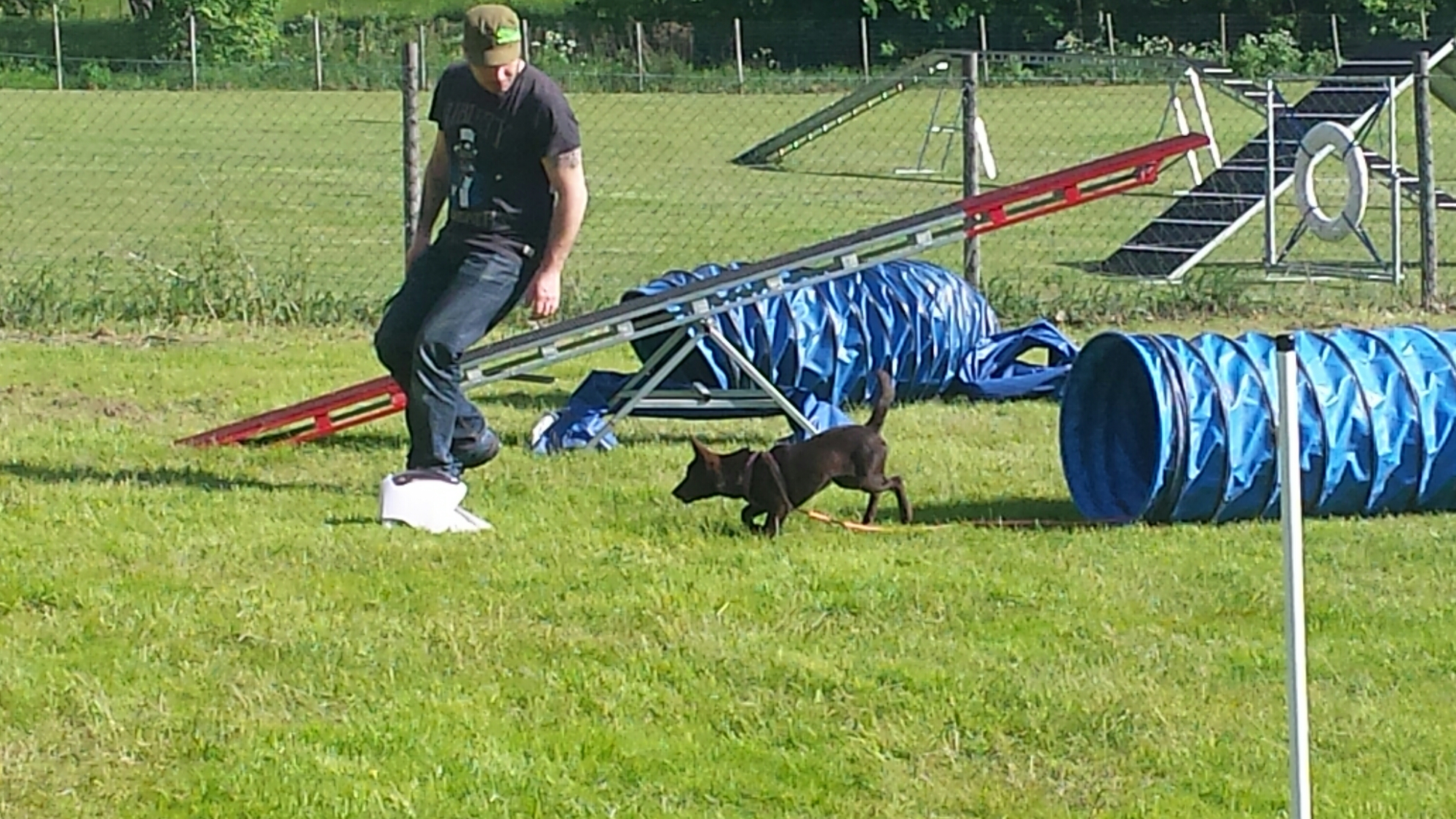 Kira tränar tunneln med treat and trainern. Riktigt skoj tycker hon. Vi var och tränade lite kontaktfält inför SM i lördags. Det var rejält varmt och varken vi eller hundarna är vana vid värmen. Så vi körde bara ett kort pass.
