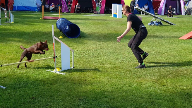 Jinnie nollade båda hopploppet, det ena en placering från pinne. I agilityklassen blev det en retlig disk och ett lopp med 15 fel (kontaktfält balansen, 2 vägran). Hon gick bra hela helgen, jag hade kunnat jobba på henne bättre vid balansen och även stöttat henne mer vid hindren. Hon låste inte klart innan jag stack och ibland är hon väldigt känslig på det. En hopploppet jag körde sa jag nog Jinnie ca 54 gånger 😀 men det är då vi kör som bäst.