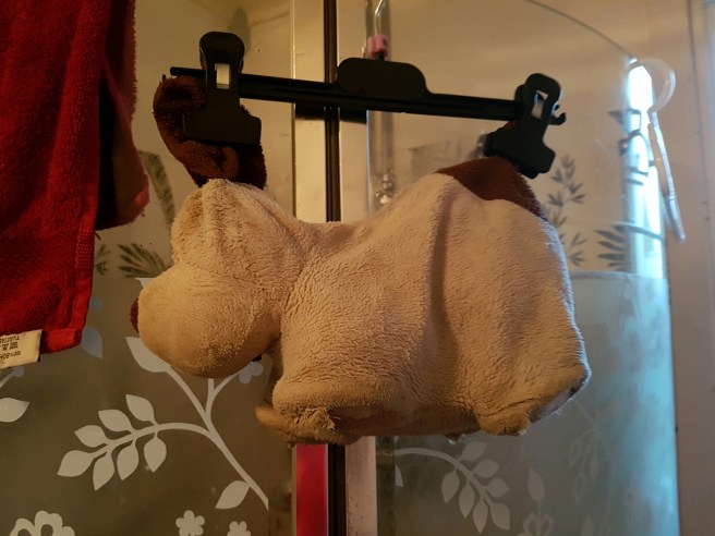 Nu hänger han där, blöt och enögd. Doftandes såpa. Imorgon får han kramas med Lukas igen och förhoppningsvis kommer Hundis över denna chocken, han har ärren som minne.