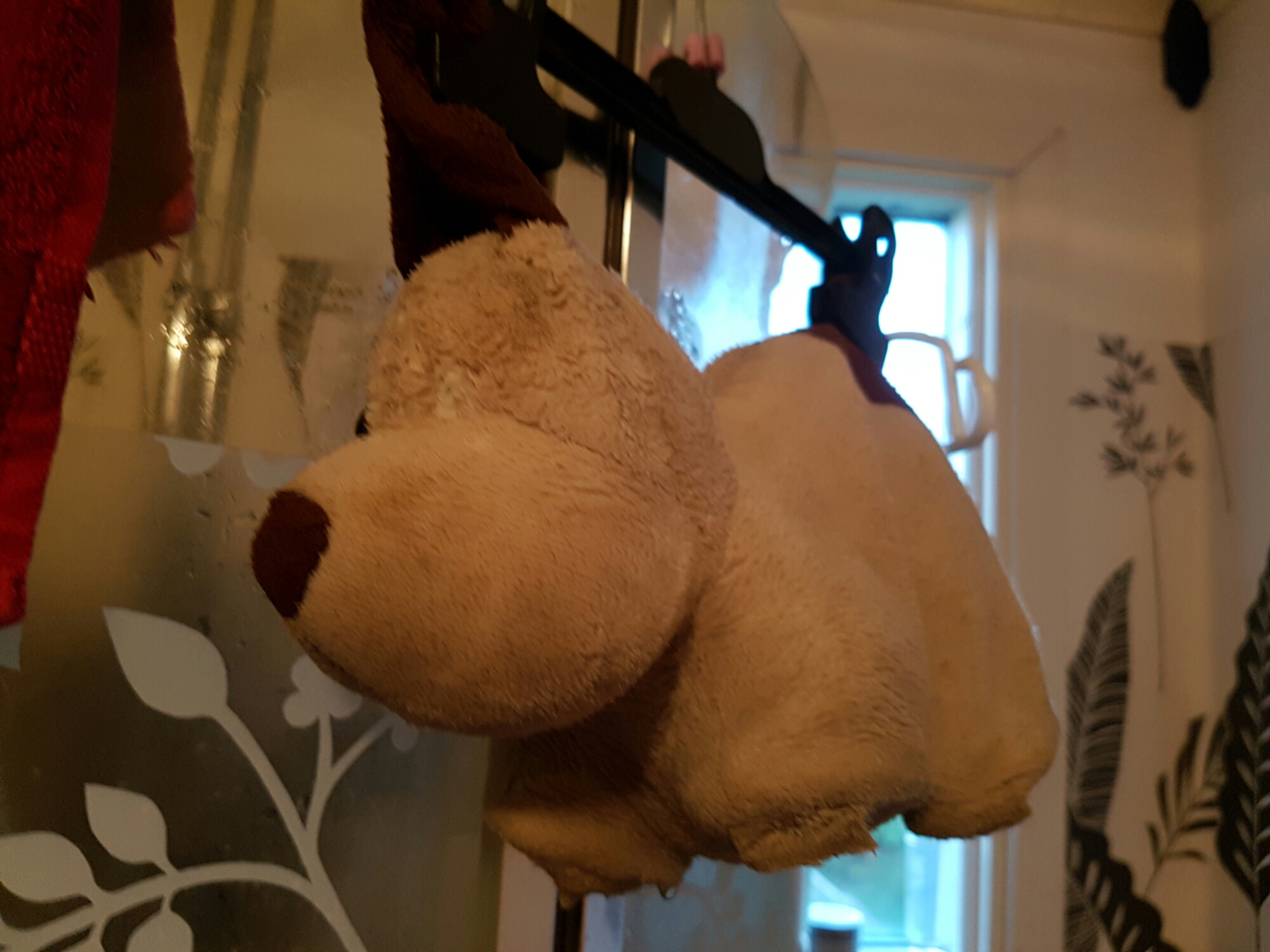 Nu hänger han där, blöt och enögd. Doftandes såpa. Imorgon får han kramas med Lukas igen och förhoppningsvis kommer Hundis över denna chocken, han har ärren som minne.