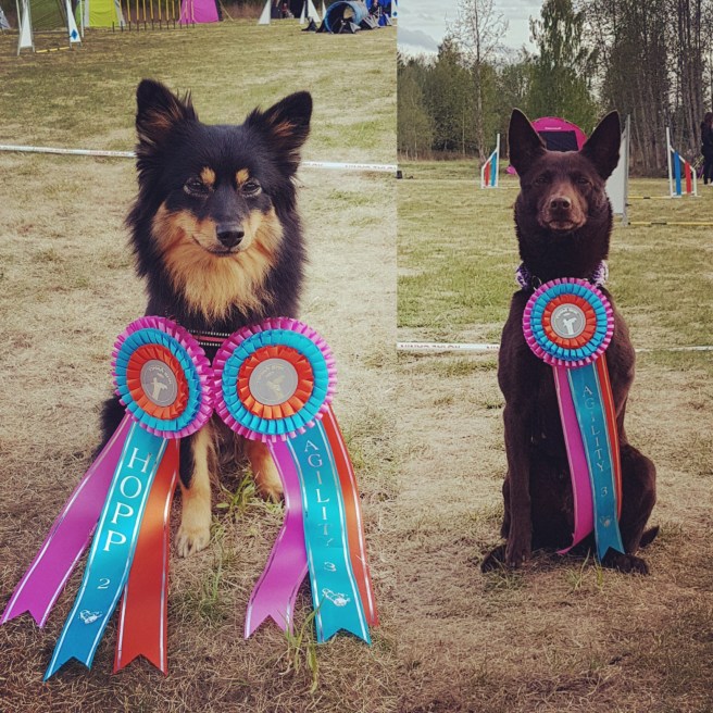 Tesla blev det en disk i agilitylagklassen, men hon satte runningsen! I agilityklass 1 satte hon dom med och vi kom runt med 0 fel, kom på 3 plats och tog vår första agilitypinne!! I hoppklassen räddade Tesla sin trötta matte som tappat hjärna och ben, så vi fick en nolla och kom på 2 plats och därmed har hon nu 3 hoppinnar och vi får starta i klass 2 när vi känner för det 🙂
