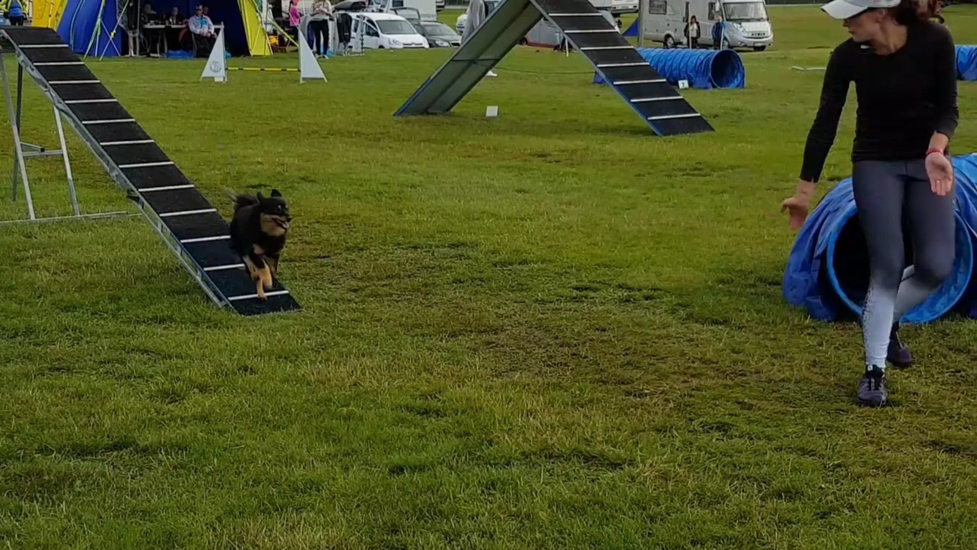 Jinnie missade jag att pusha runt ett hinder i hoppklassen tyvärr, i agilityklassen hade hon bråttom av gungan 😉 Tesla sprang jag bara på med i hoppklassen, i agilityn satte hon runningen på balansen (Yes!) Fick ett par vägran och hon missbedömde tyvärr gungan och flög av den.