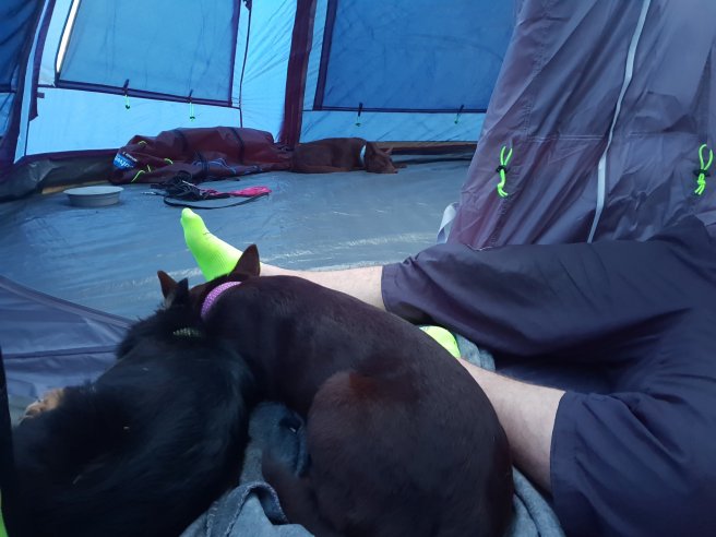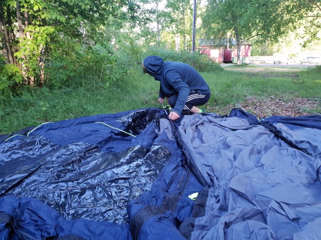 Det tog oss 20minuter att få upp tältet, och då har vi aldrig ställt upp det förut. Klart godkänt. Lär gå fortare nästa gång. Myggen höll oss sällskap… 10 minuter att ta ner och packa ihop det 👊