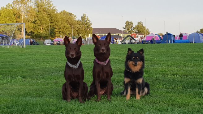 Johan kom ner på fredagkvällen tillsammans med valparna, och vi sov i tält under natten. På lördagen var det individuella lopp, båda kelpiesessorna nollade hopploppen, för Lilja blev det 2 SM pinnar och för Kira 1. Tesla var jag lite sen i mina kommandon och då har hon redan låst på hinder, hon är så mycket kvickare att låsa på hinder än kelpiesessorna.