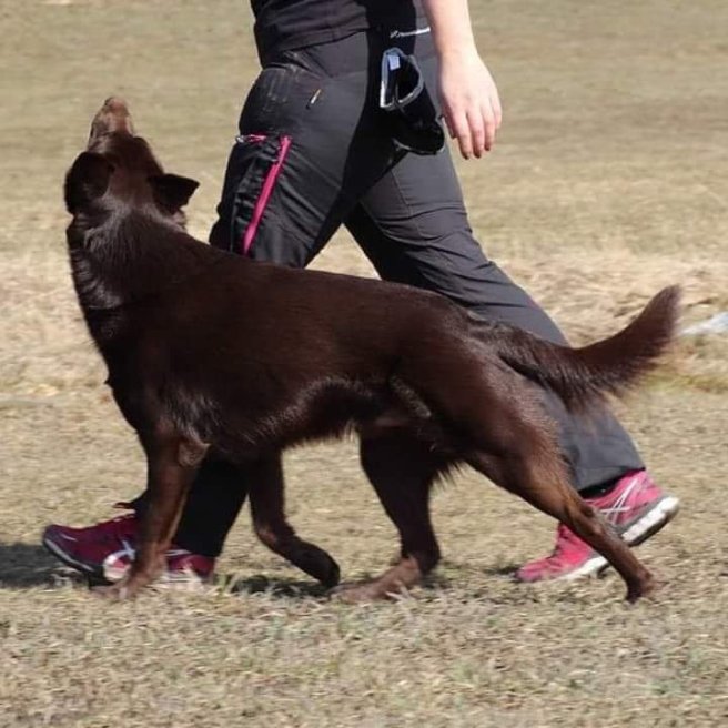 I träningen speglar sig det mindre sociala behovet i att hon mest tycker det är störande när man ska gosa med henne. Det är mycket mer värt att arbeta eller snarare studsa och skalla i en belöning. Jag personligen gillar dessa drag, det är skönt då hon inte är intresserade av människor på promenader. Personligen gillar jag själv allvaret i träningen och att hon tar det på allvar att träna.