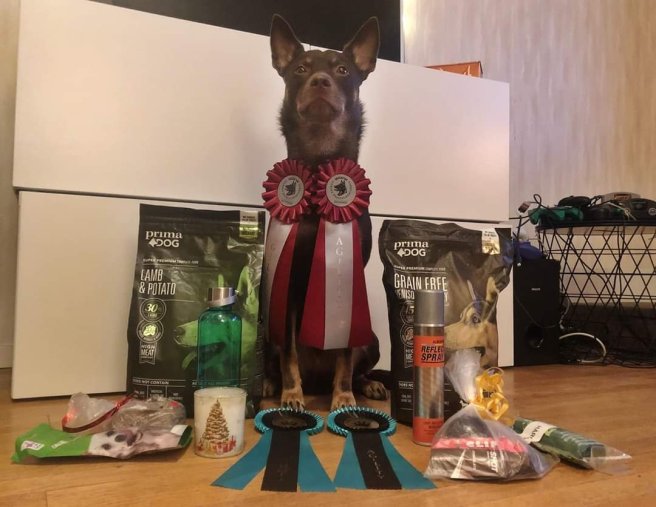Idag var det min tur att springa och han springer hem två vinster med pinnar i dagens två lopp🥳. Hans statistik är HELT galen. På två stycken tävlingshelger, 9 lopp sprungna, har han tagit 4 hoppinnar och 3 agilitypinnar och är därmed uppflyttad till klass två i både hopp och agility!🐾❣