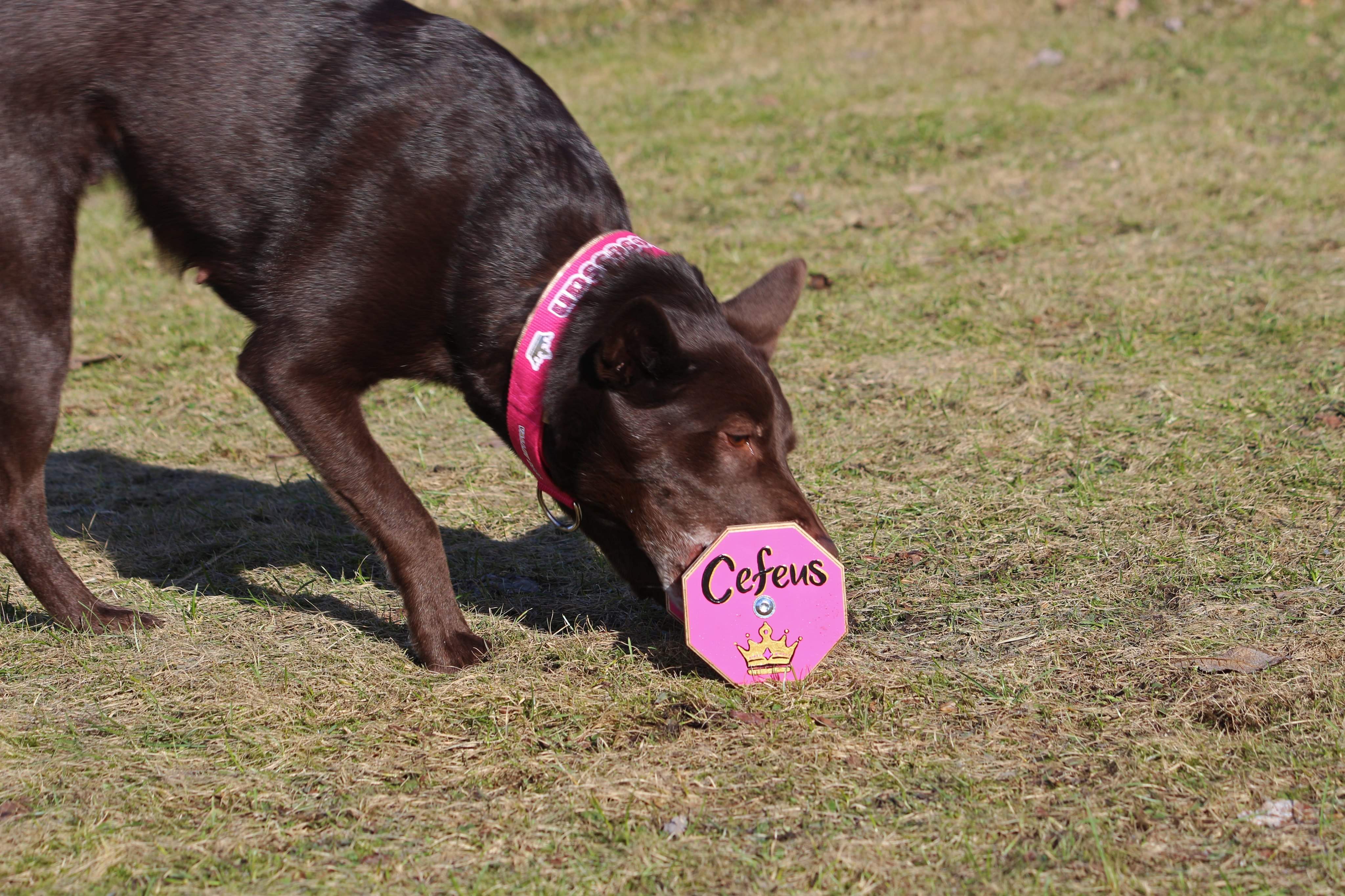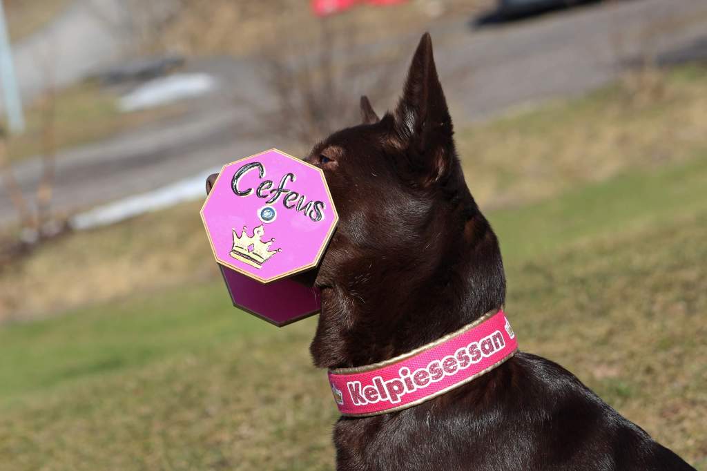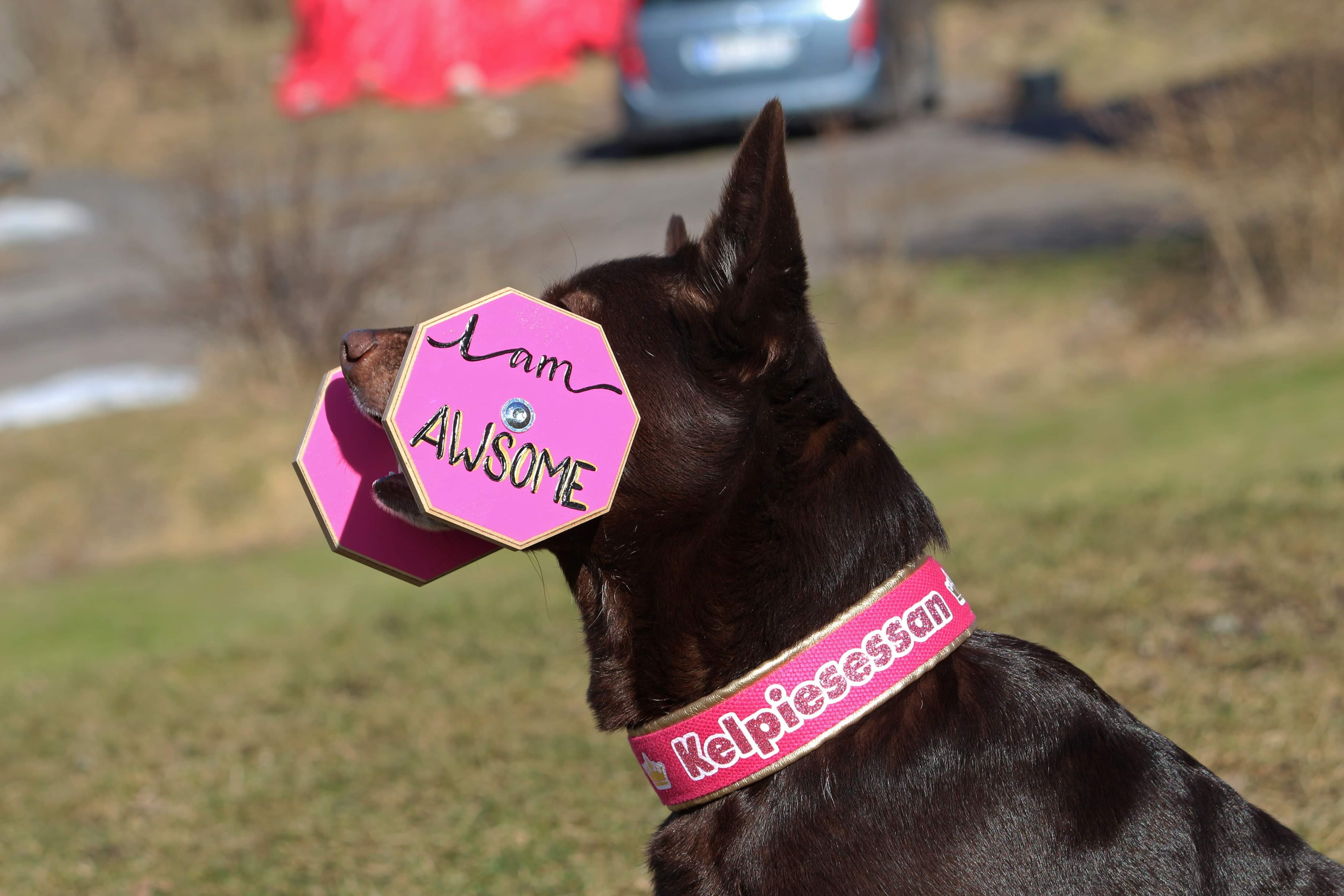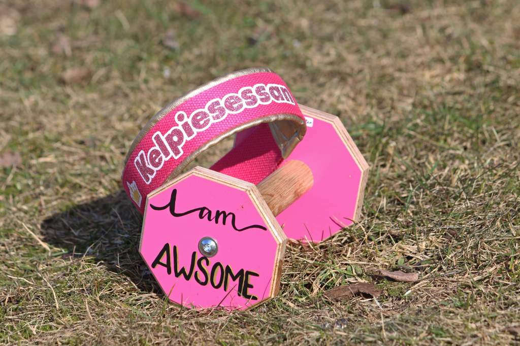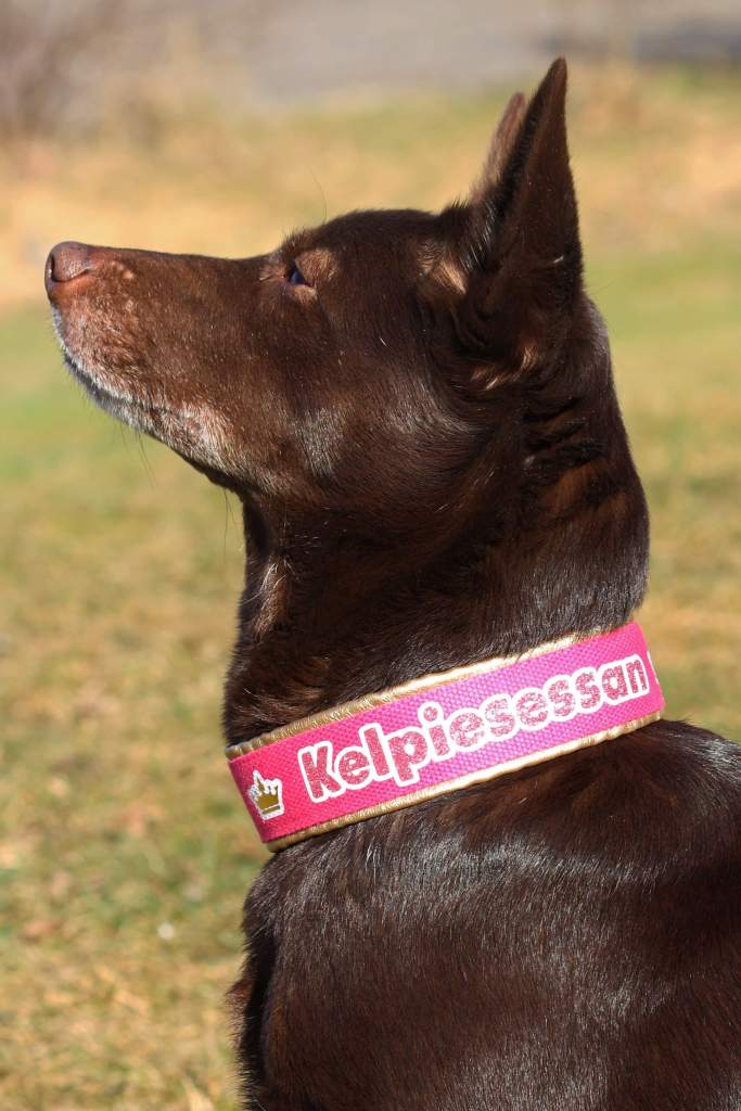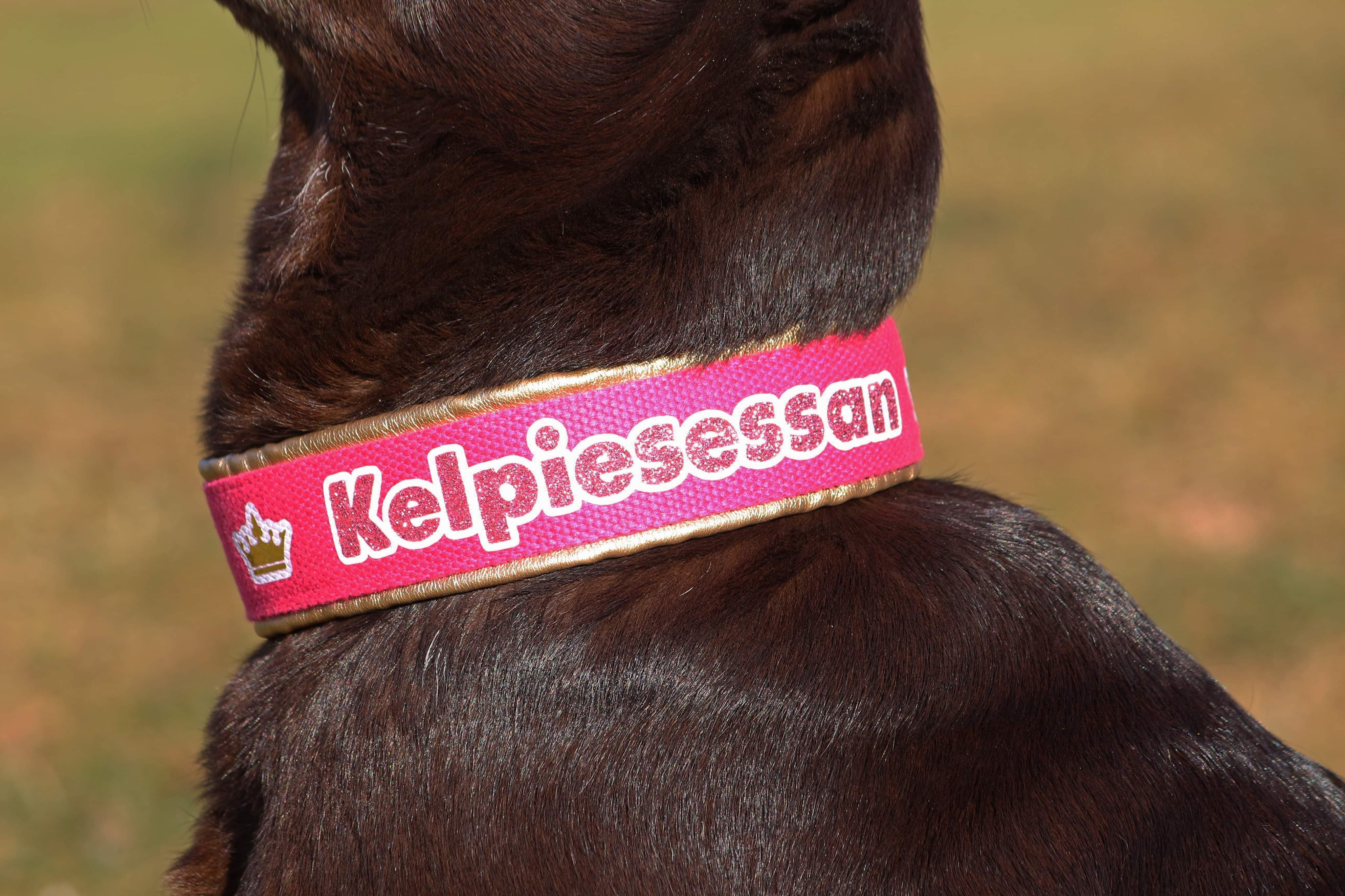 Halsband med snyggt glittertryck Kelpiesessan med rosa, guld och prinsesskrona från ValleyDogs.se