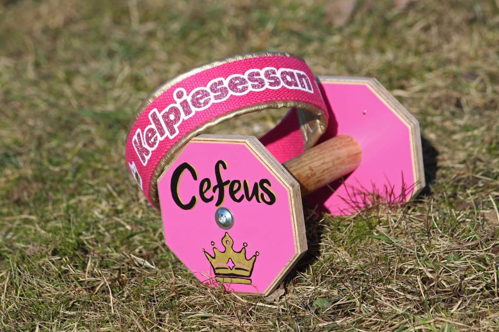 Rosa apportbock med prinsesskrona och text Cefeus och I am awsome från LG apporter